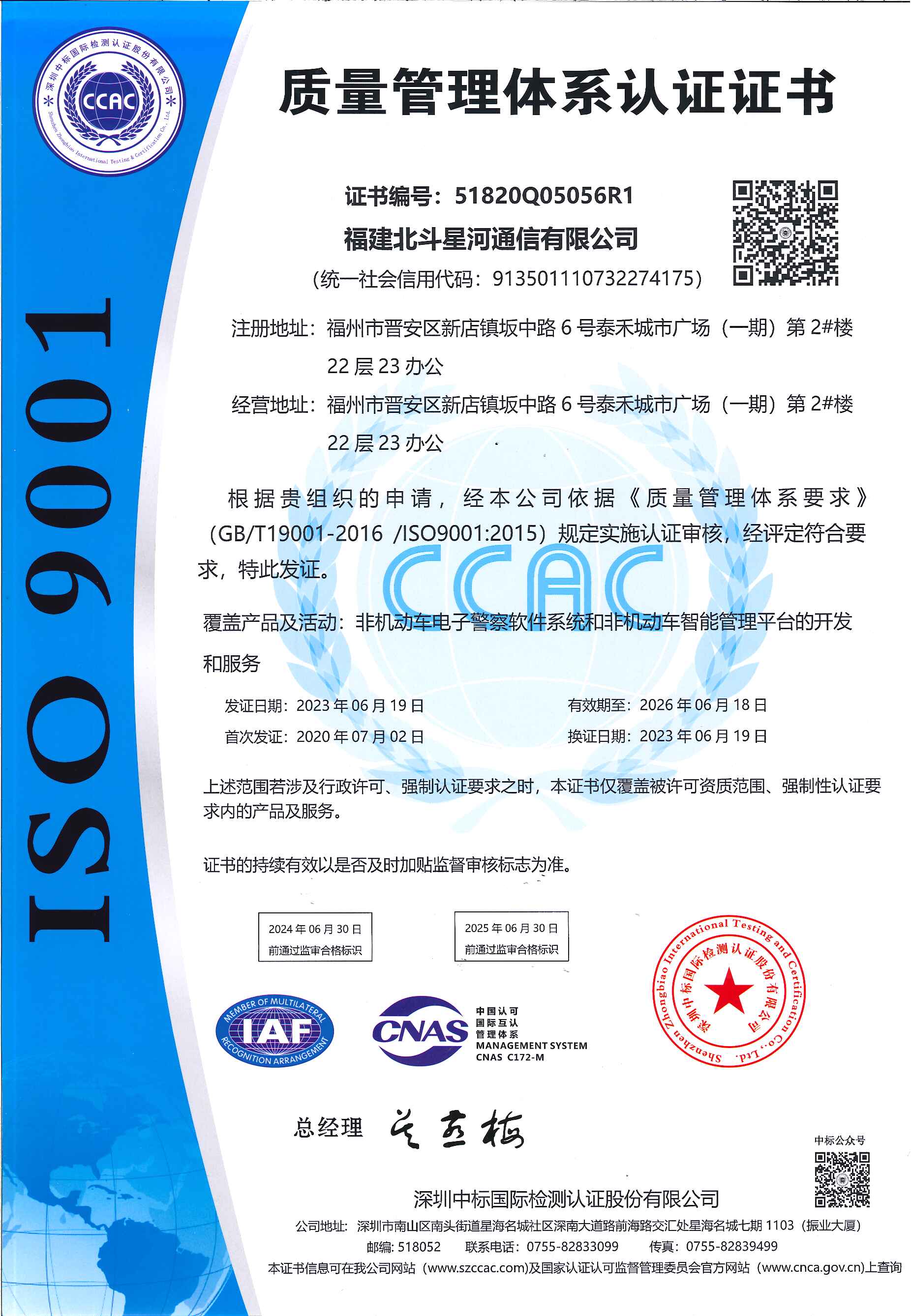 质量管理体系认证证书