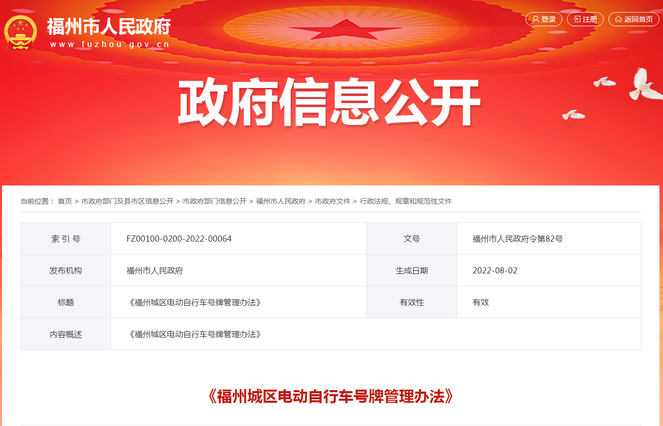 《福州城区电动自行车号牌管理办法》经2022年7月28日市十六届政府第25次常务会议通过,自2022年9月1日起施行,规定福州五城区电动自行车要附加红、绿标识实行动态管理,对于不佩戴安全头盔的驾乘人将处警告或50元罚款。